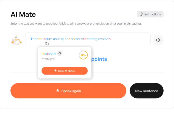 Enter the text you want to practice. AI Mate will score your pronunciation after you finish speaking.